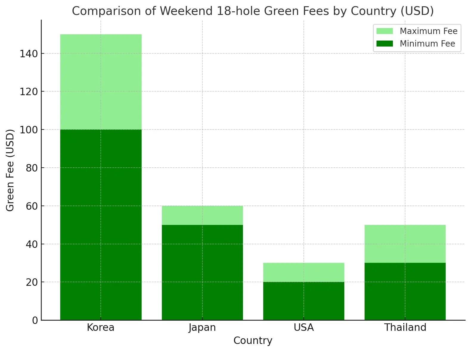 일본은 골프 인구 감소로 그린피가 낮아졌고, 미국은 퍼블릭 코스가 많아 저렴합니다. 반면, 한국은 제한된 골프장 수와 높은 수요로 가격이 높게 형성됩니다.
