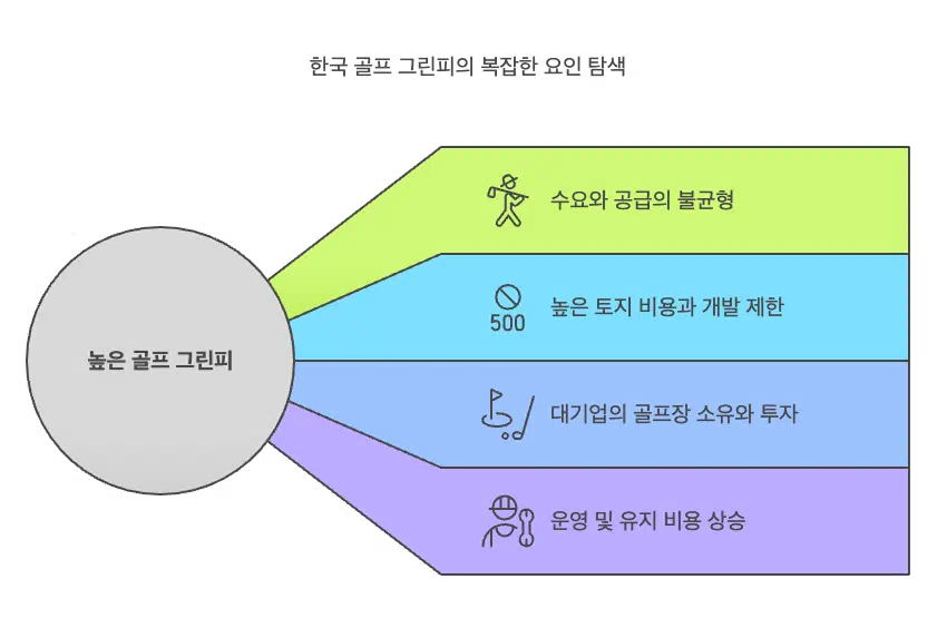 왜 한국의 그린피는 이렇게 비쌀까요? 이는 단순히 물가 차이로 설명할 수 없는 복합적인 요인들이 얽혀 있습니다. 아래에서 그 원인을 하나씩 분석해 보겠습니다.