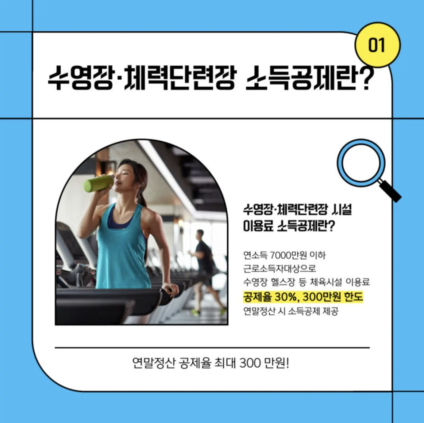 가장 궁금한 부분이죠? 운동 시설 이용료는 총급여액에 따라 공제율이 달라져요. 총급여의 7천만원 이하인 근로소득자가 대상이며, 문화비 공제와 합산하여 300만원 한도 내에서 30%를 공제받을 수 있습니다.