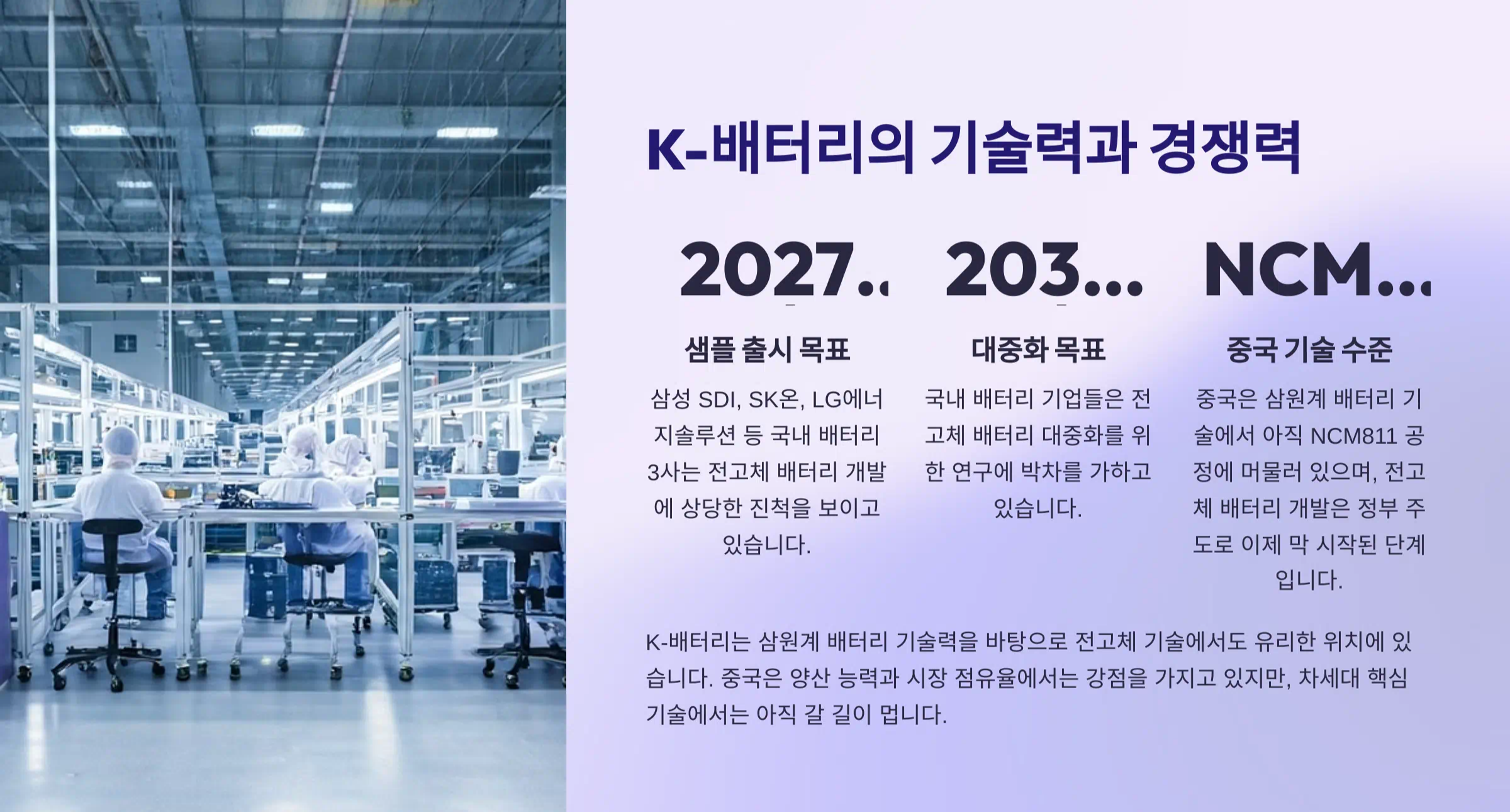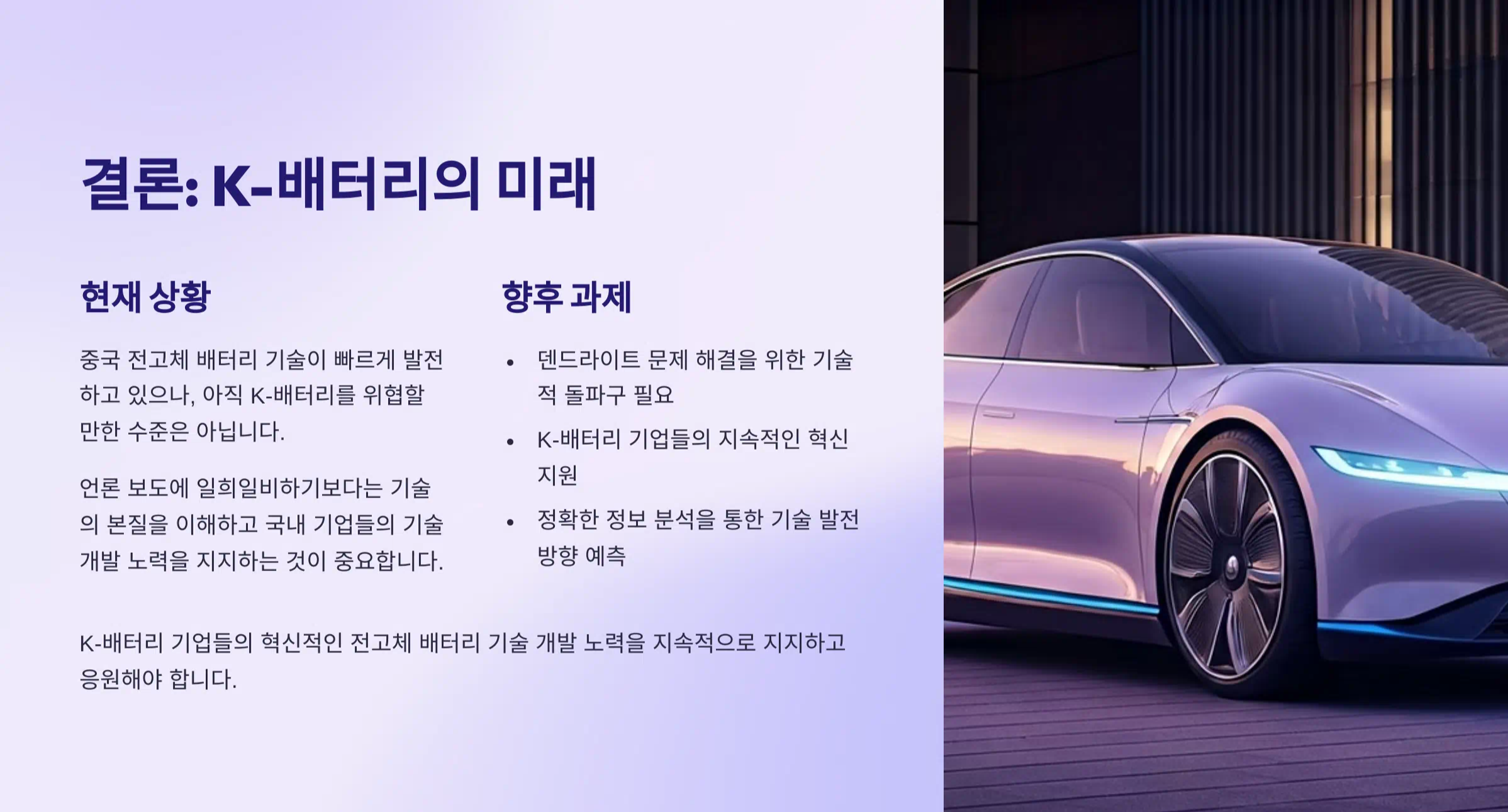 - 대한민국 K-배터리 기업들의 혁신적인 전고체 배터리 기술 개발 노력을 지속적으로 지지하고 응원해야 합니다.