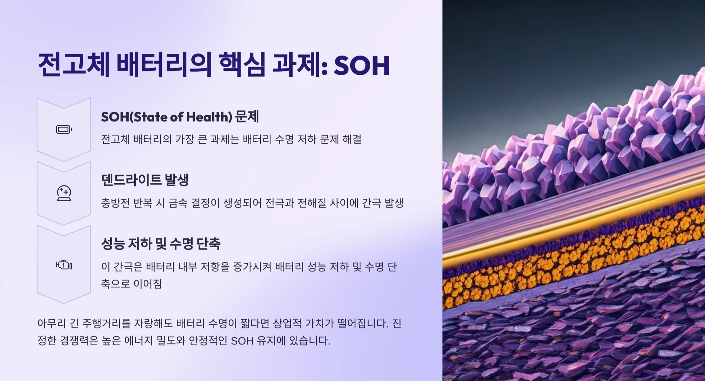전고체 배터리가 넘어야 할 가장 큰 산은 무엇일까요? 바로 'SOH(State of Health)' 즉, 배터리 수명 저하 문제를 해결하는 것이 핵심 과제라고 강조합니다. 기존 리튬이온 배터리와 달리 고체 전해질을 사용하는 전고체 배터리는 충방전이 반복될 때 덴드라이트(금속 결정)가 발생하여 전극과 전해질 사이에 간극이 생기기 쉽습니다. 이 간극은 배터리 내부 저항을 증가시키고, 이는 곧 배터리 성능 저하 및 수명 단축으로 이어지는 치명적인 문제입니다.