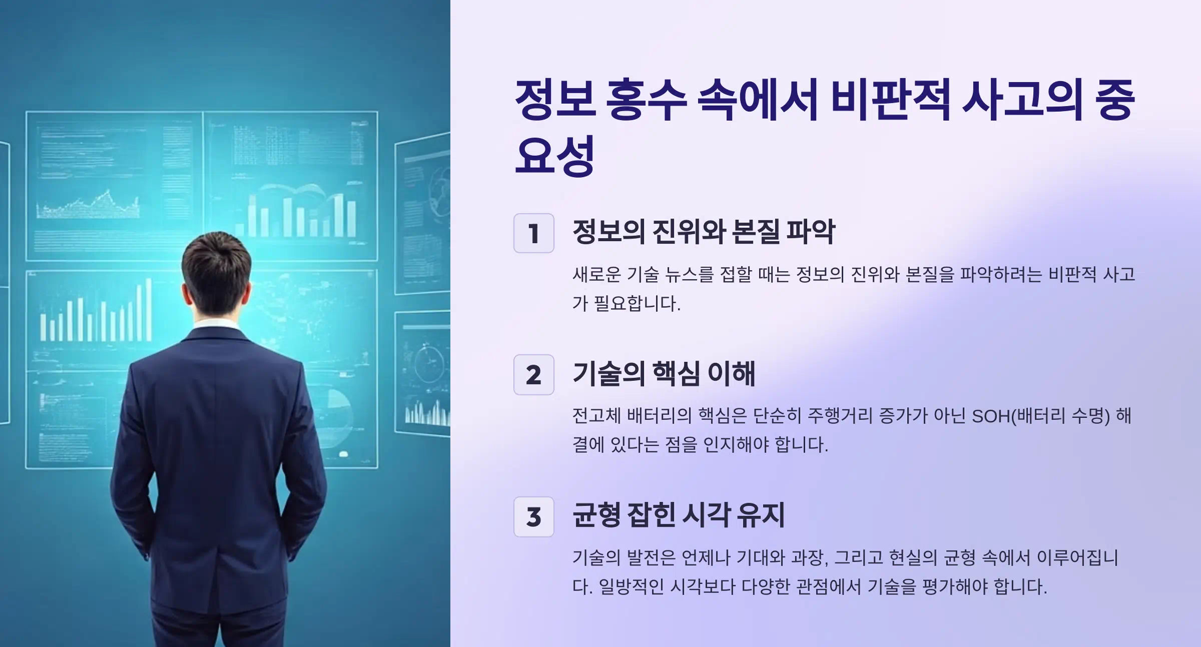 - 새로운 기술 뉴스를 접할 때는 정보의 진위와 본질을 파악하려는 비판적 사고를 갖는 것이 중요합니다.