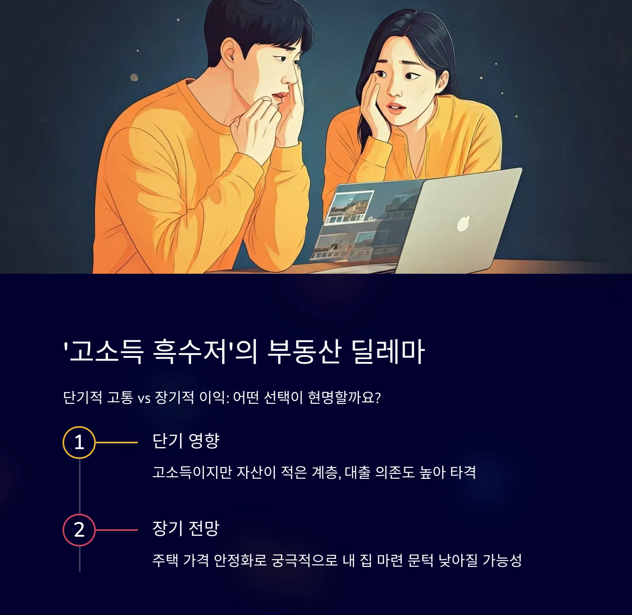 하지만 일각에서는 높은 소득에도 불구하고 자산이 없는 이른바 '고소득 흑수저' 계층이 불리해질 수 있다는 우려도 제기됩니다. 이들은 고가 주택 구매 시 필요한 막대한 자금을 대출에 의존해야 하는데, 이번 규제로 인해 그 기회가 제한될 수 있기 때문입니다. 이에 대해 부동산 전문가들은 장기적으로 주택 가격이 안정화되거나 하락한다면, 이는 결국 '고소득 흑수저'들에게도 내 집 마련의 문턱을 낮춰주는 긍정적인 효과로 작용할 것이라고 전망합니다. 단기적인 고통은 있을 수 있지만, 장기적인 시장 안정화가 가져올 이익에 주목해야 한다는 것입니다.