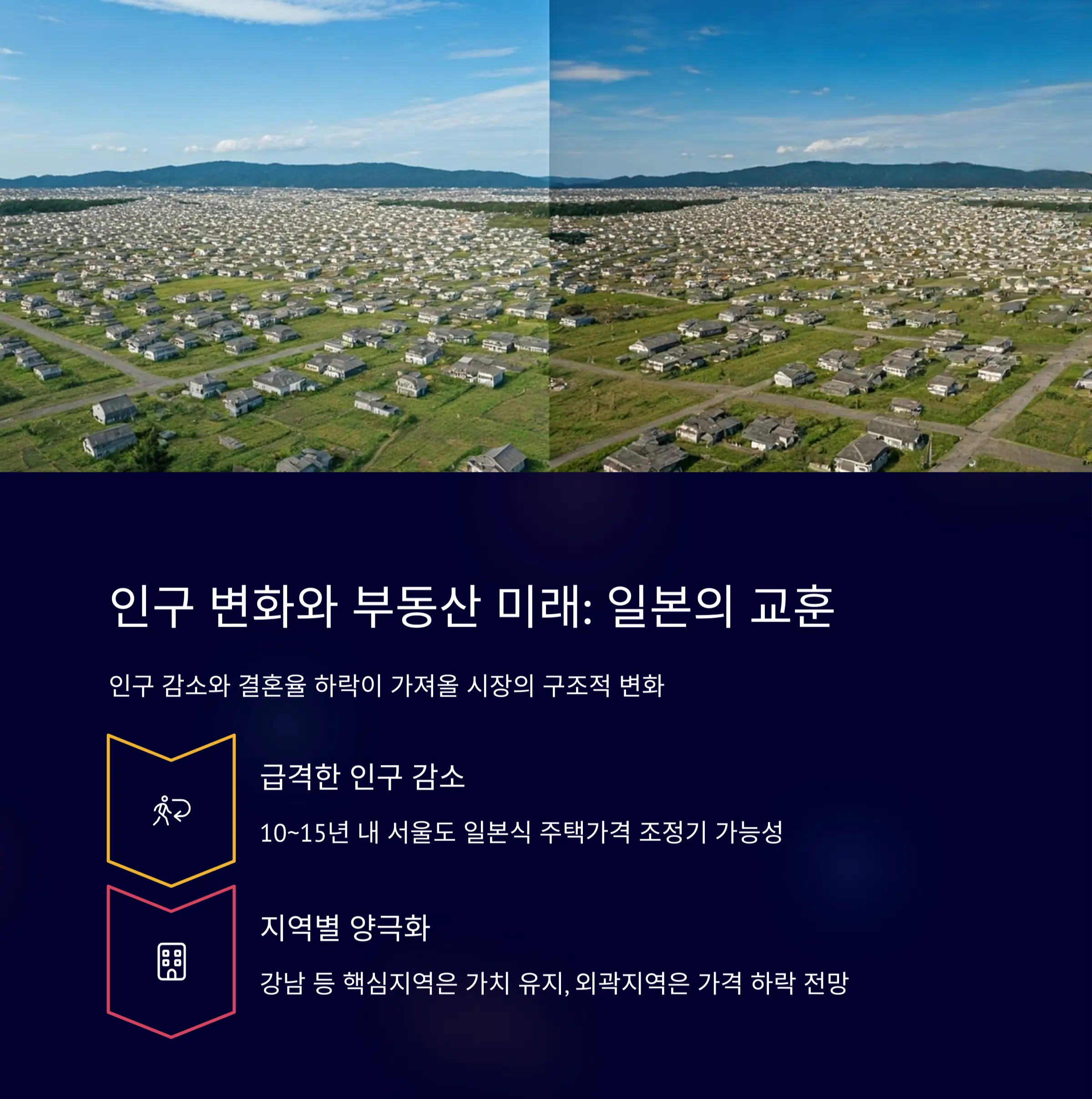 이번 규제와 더불어 한국 부동산 시장의 미래를 예측하는 데 있어 간과할 수 없는 중요한 요소는 바로 인구 변화입니다. 전문가들은 한국의 급격한 인구 감소와 결혼율 하락이 장기적으로 주택 수요에 심각한 영향을 미칠 것이라고 경고합니다. 그는 10~15년 이내에 서울조차도 일본과 같은 주택 가격 조정기를 맞이할 가능성이 있다고 언급하며, 이는 우리가 직면해야 할 현실적인 미래라고 강조합니다.