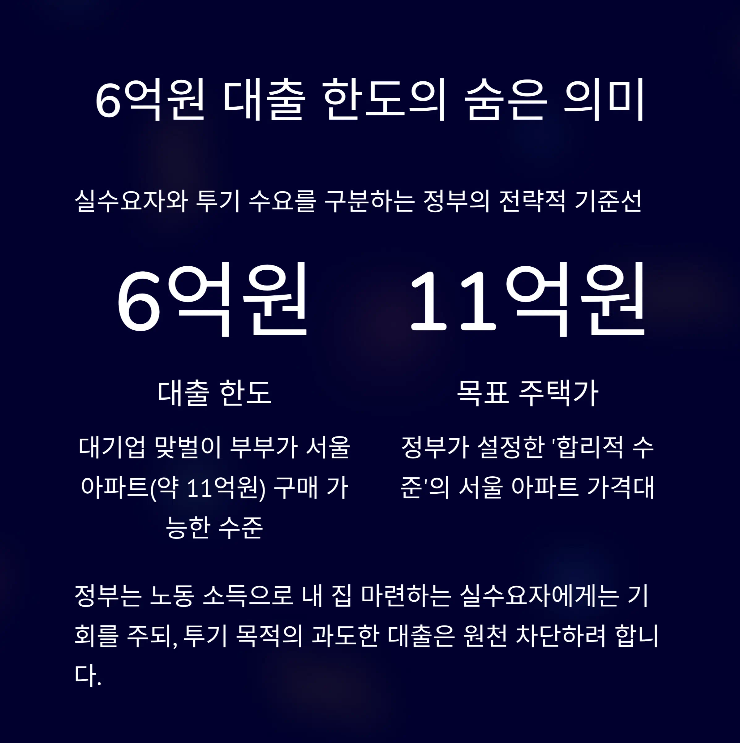 왜 하필 6억 원이라는 기준이 설정되었을까요? 부동산 전문가들은 이 금액이 대기업 맞벌이 부부가 합리적인 수준의 서울 아파트(약 11억 원대)를 구매할 수 있도록 설계된 기준이라고 설명합니다. 즉, 순수 노동 소득으로 내 집 마련을 꿈꾸는 실수요자들에게는 여전히 기회를 주되, 투기적 목적의 과도한 대출을 통한 갭투자는 차단하겠다는 의도가 담겨 있는 것입니다.