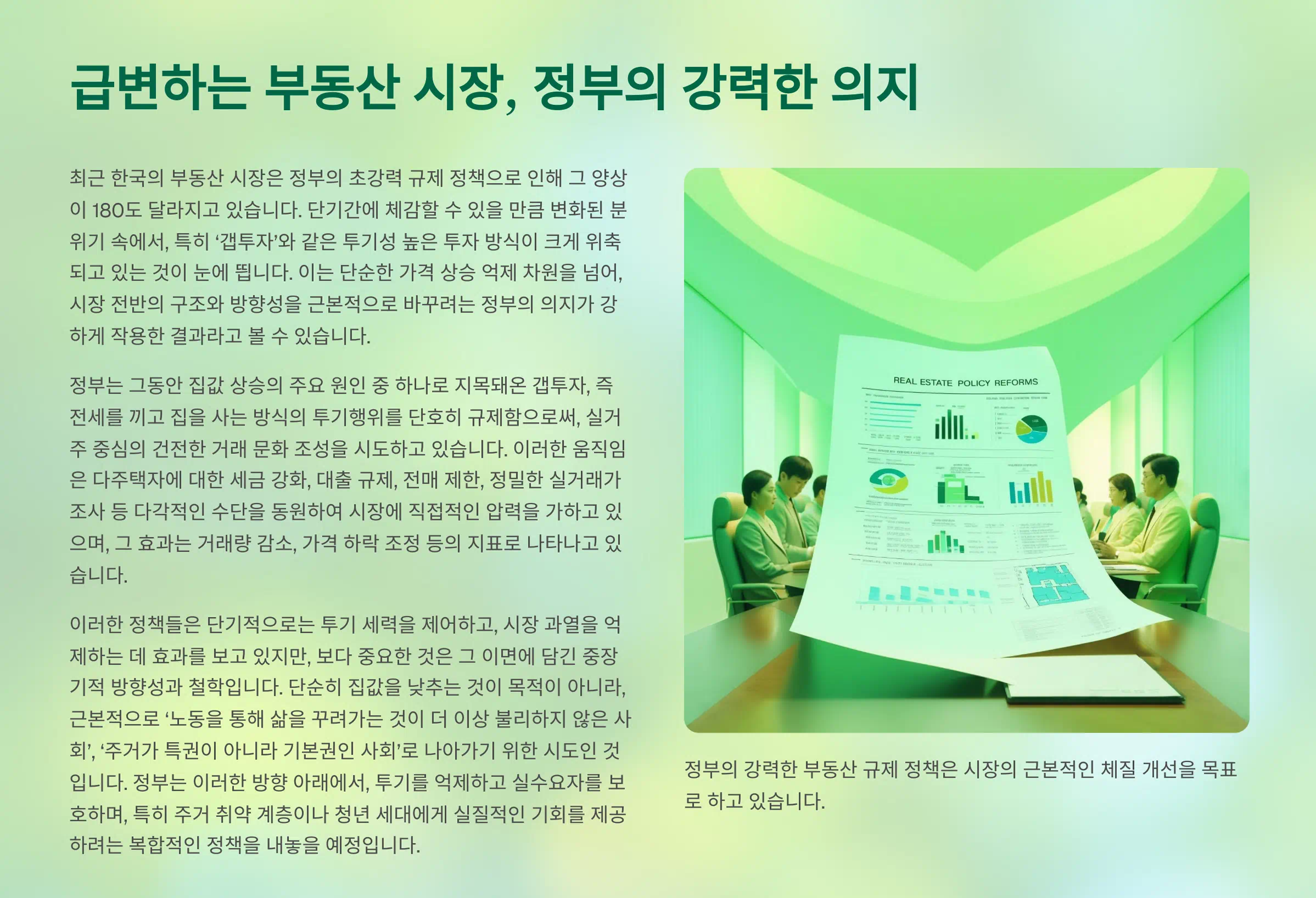 최근 한국 부동산 시장은 정부의 초강력 규제 정책으로 인해 180도 달라진 모습을 보이고 있습니다. 특히 '갭투자'와 같은 투기적 투자를 억제하기 위한 정부의 단호한 움직임은 시장에 즉각적인 영향을 미 미치고 있습니다. 단순히 단기적인 시장 안정을 넘어, 중장기적인 관점에서 노동의 가치를 회복하고 젊은 세대에게 공정한 주거 환경을 제공하려는 정부의 강력한 의지가 담겨 있다는 분석이 나옵니다. 과연 이러한 규제들이 시장에 어떤 변화를 가져오고, 앞으로 우리는 어떤 정책 변화를 주시해야 할까요?