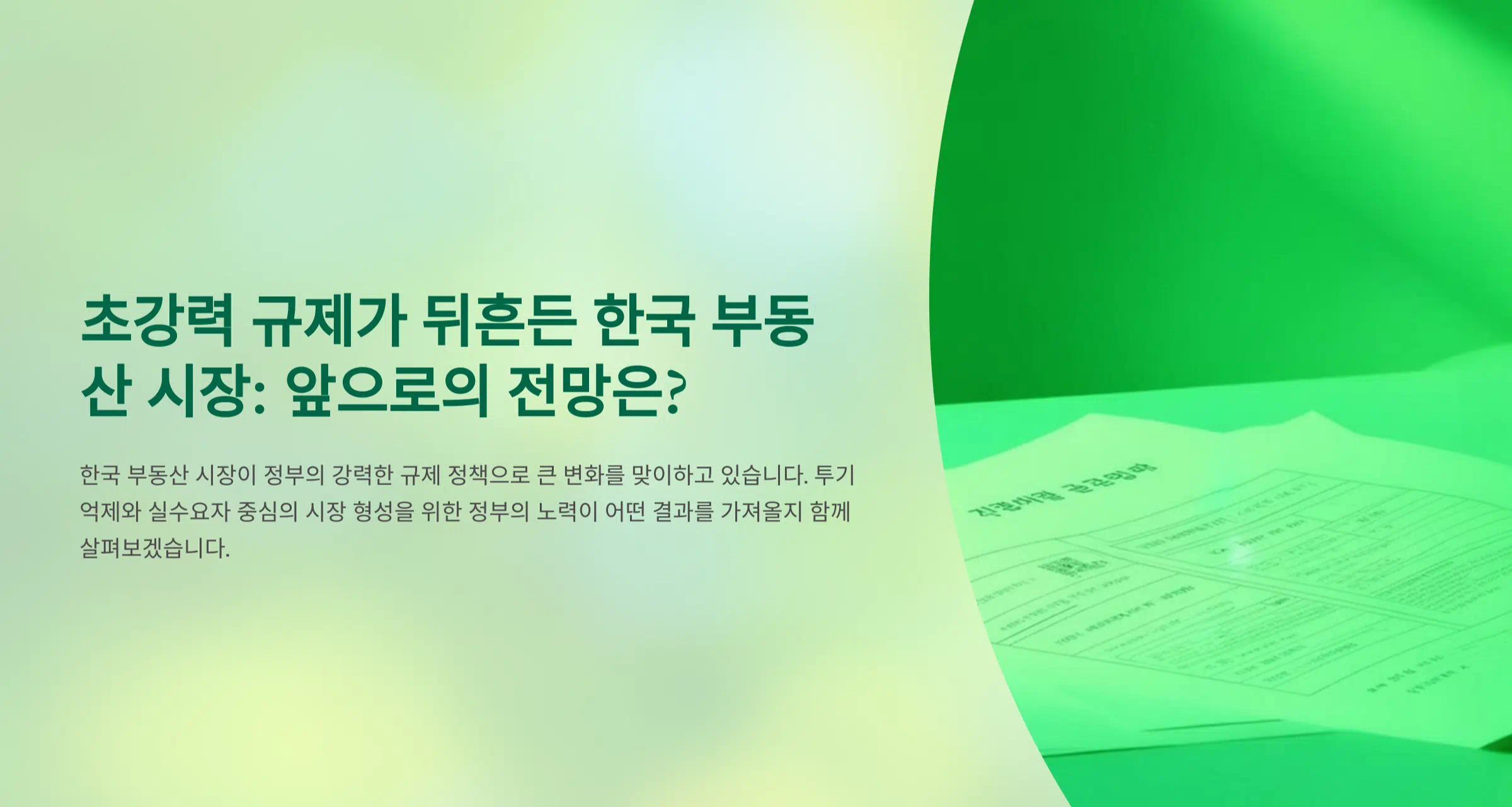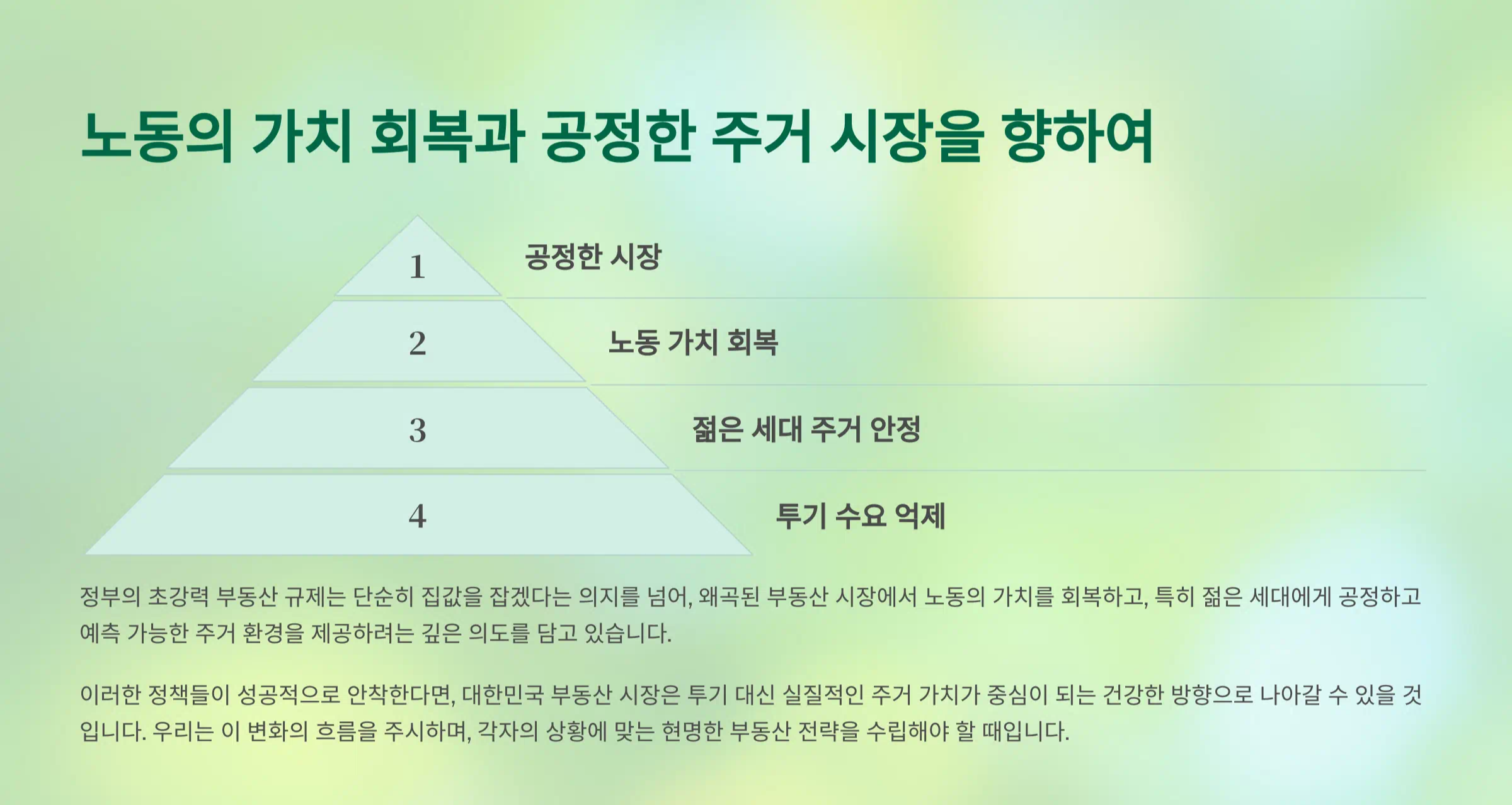 정부의 초강력 부동산 규제는 단순히 집값을 잡겠다는 의지를 넘어, 왜곡된 부동산 시장에서 노동의 가치를 회복하고, 특히 젊은 세대에게 공정하고 예측 가능한 주거 환경을 제공하려는 깊은 의도를 담고 있습니다. 이러한 정책들이 성공적으로 안착한다면, 대한민국 부동산 시장은 투기 대신 실질적인 주거 가치가 중심이 되는 건강한 방향으로 나아갈 수 있을 것입니다. 우리는 이 변화의 흐름을 주시하며, 각자의 상황에 맞는 현명한 부동산 전략을 수립해야 할 때입니다.