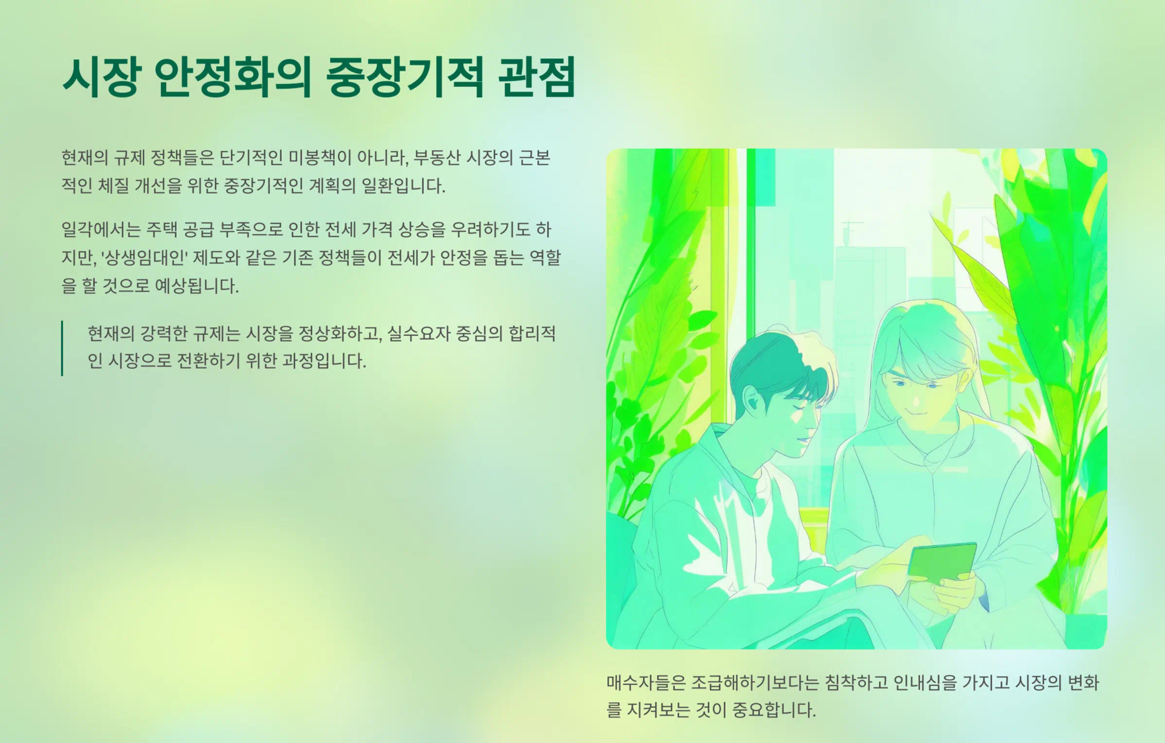 정부의 초강력 부동산 규제는 단기적 시장 안정뿐만 아니라, 장기적으로는 노동의 가치를 회복하고 청년 세대에게 공정한 주거 기회를 제공하려는 의지를 담고 있습니다. 앞으로 정책들이 성공적으로 안착한다면, 투기보다 실수요 중심의 건강한 시장으로 전환될 것으로 기대됩니다. 여러분의 생각은 어떠신지요?
