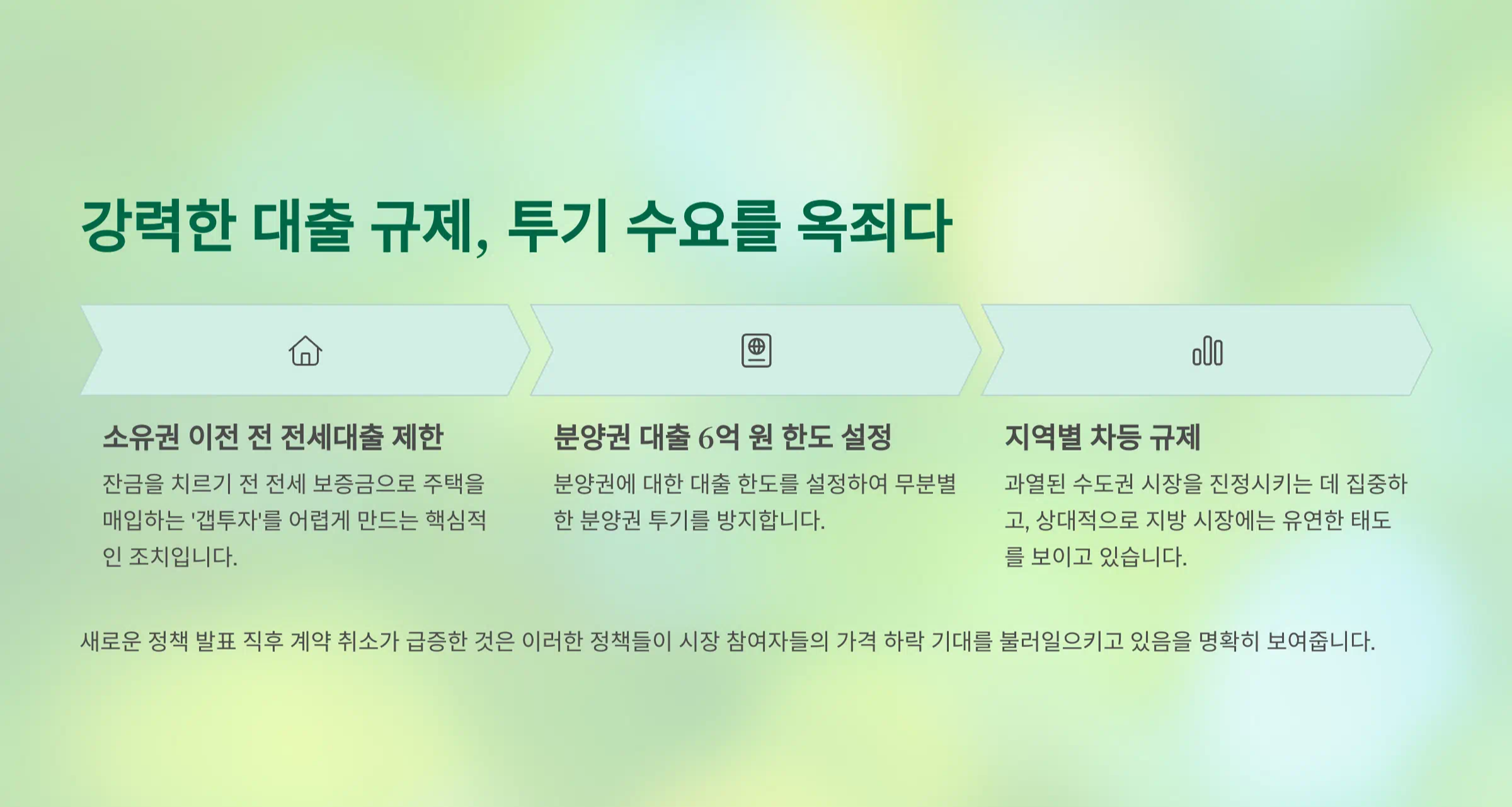 정부의 규제는 단순히 시장에 경고를 보내는 수준을 넘어, 실질적인 대출 규제 강화를 통해 투기 수요를 직접적으로 억제하고 있습니다. 새로운 정책 발표 직후 계약 취소가 급증한 것은 이러한 정책들이 시장 참여자들의 가격 하락 기대를 불러일으키고 있음을 명확히 보여줍니다.